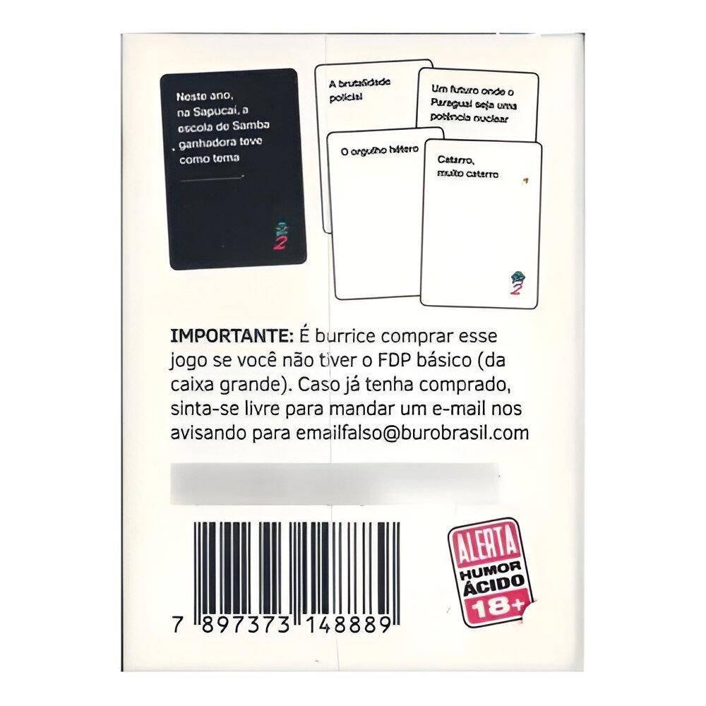 Expansão com 50 novas cartas para o conjunto básico de FDP. São 40 novas cartas brancas com respostas e 10 novas cartas pretas com perguntas que podem (e devem) ser misturadas com as cartas do conjunto básico de FDP.