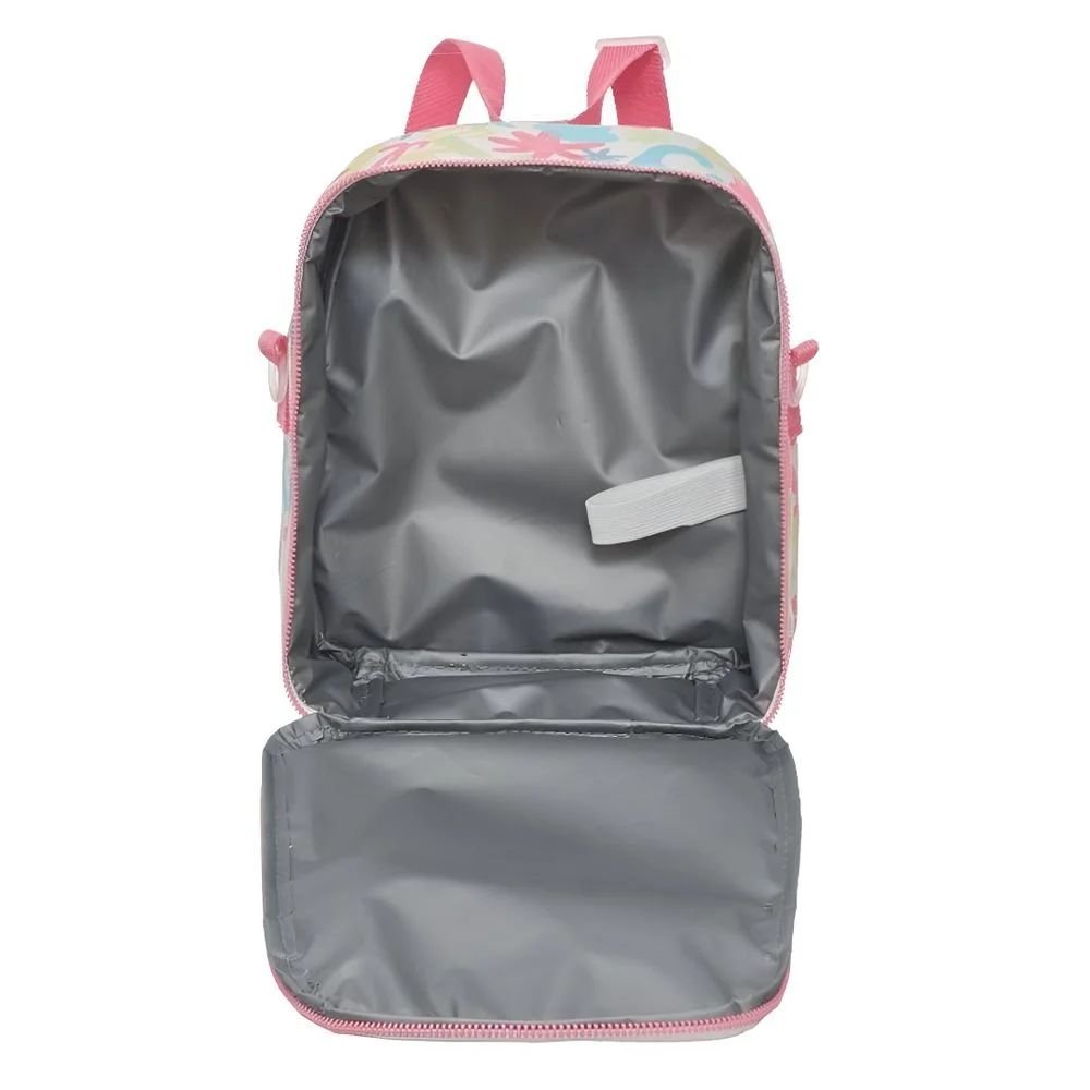 Tecnologia Térmica: O revestimento interno é térmico, ideal para manter a temperatura dos alimentos e bebidas, sejam eles quentes ou frios, garantindo a qualidade do lanche até a hora do recreio.